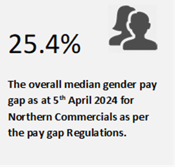 The overall gender pay gap as at 5th April 2024 was 25.4% on a median basis (18.5% using the mean pay). This represents +12.3% adverse to the national gender pay gap for all industries which is 13.1%, median (Office of National Statistics 2024).